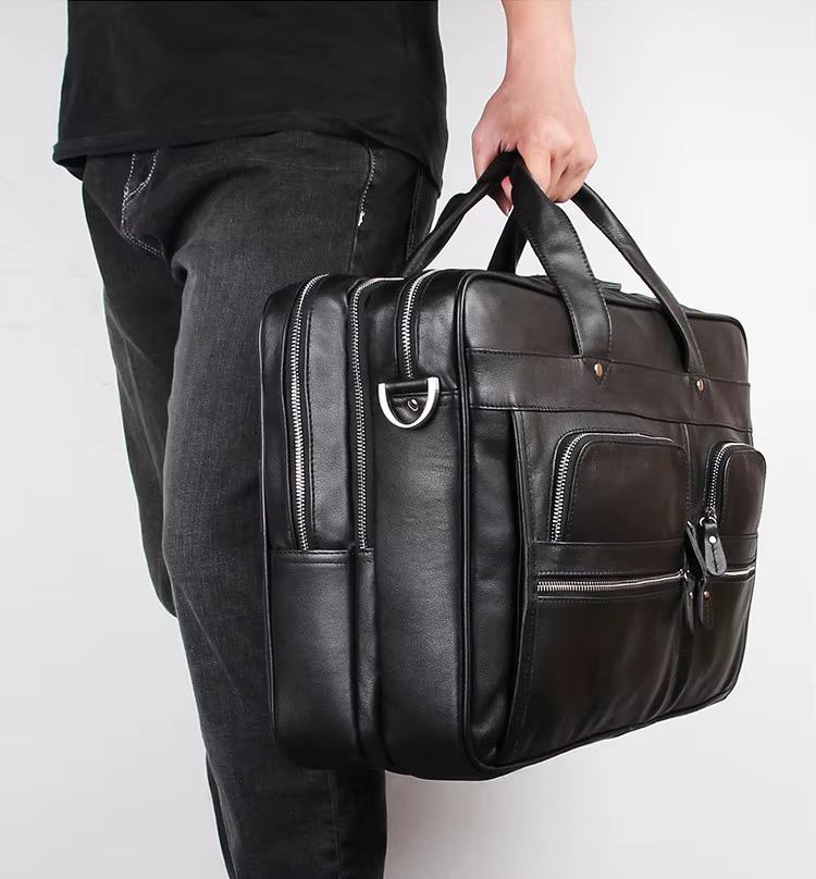 Avec ses dimensions 45 × 31 × 16 cm, ce porte-documents offre une capacité XXL sans sacrifier la silhouette.