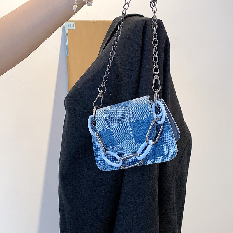 Ce mini sac à bandoulière en jean est parfait pour les femmes qui aiment les sacs à main uniques et élégants. Ce sac est fait de tissu denim de haute qualité, ce qui le rend extrêmement durable. Les chaines sont en métal argenté de haute qualité et le sac comporte une poche intérieure zippée pour garder vos effets personnels en sécurité.