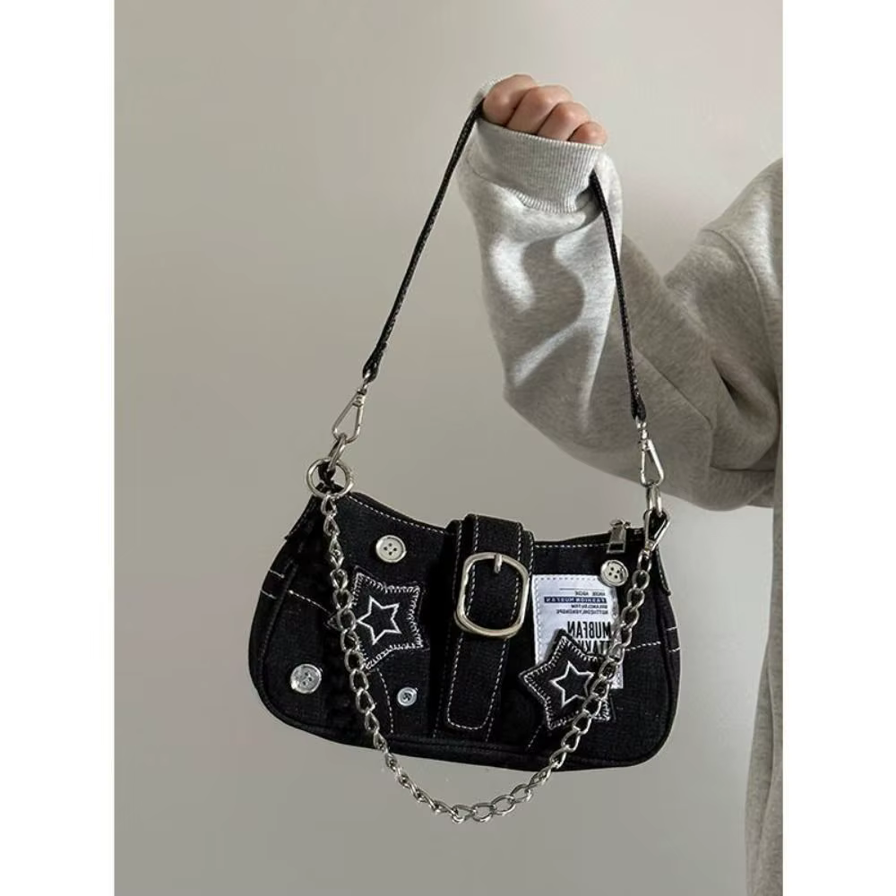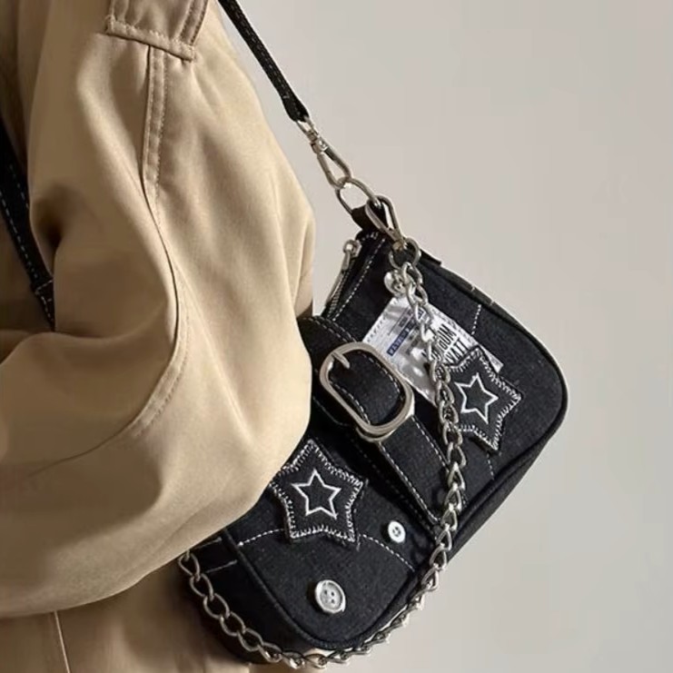 Ce sac à main ne se contente pas d’être fonctionnel, il se démarque aussi par ses détails décoratifs uniques. Une chaîne ornemente délicatement le sac, apportant une touche d’élégance rebelle. Les écussons décoratifs et les breloques en métal ajoutent une personnalité authentique, vous permettant d’afficher votre style avec confiance. Disponible en trois coloris (noir, bleu foncé et bleu clair) ce sac super tendance façon jean s’adapte à toutes les occasions et à toutes les envies.