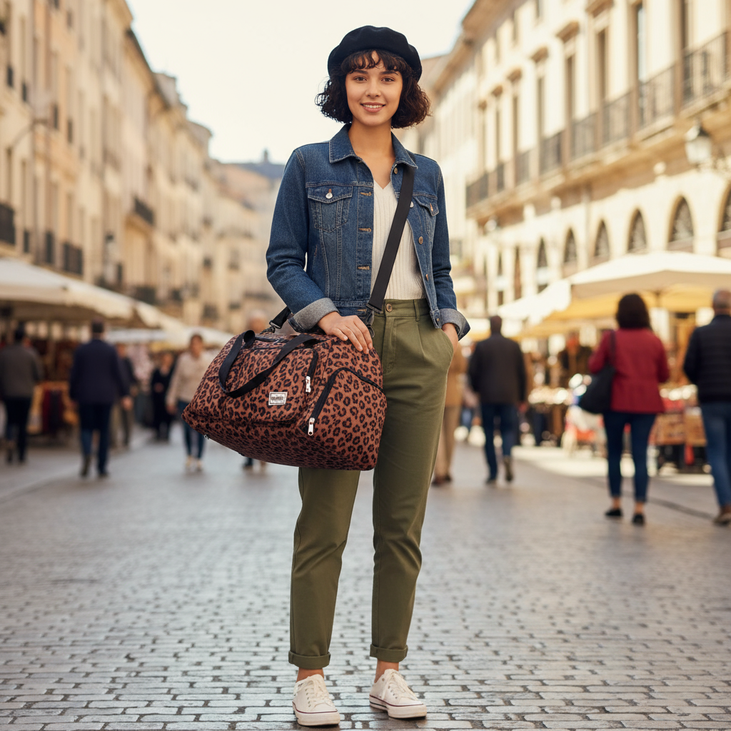 Ce sac de voyage à imprimé léopard allie style et fonctionnalité. Avec son allure moderne et son look animalier, il attire le regard tout en restant pratique pour le quotidien.